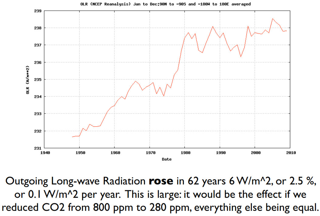 * Rising Outgoing Long-wave radiation with more than 3.7 W/m^2 per oC SST cannot be the effect of rising CO2 or of the increase of other “greenhouse” gases. Rising OLR/SST with 8.6 W/m^2K means that the atmosphere has become more transparent to IR radiation in the past 60 years. The “greenhouse effect” has become less.