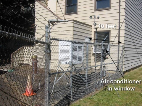 At this site in Oregon, the hot exhaust air from an air conditioner blows directly on a temperature shelter. Asphalt and buildings nearby radiate ambient heat as well.