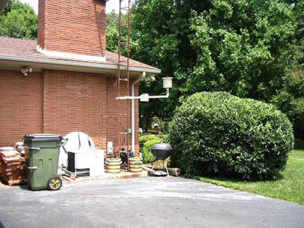 This temperature sensor sits awfully close to a house, with an air conditioning unit nearby, automobile parking, and the chimney for a fireplace. Note also the barbecue grill — directly beneath the sensor.
