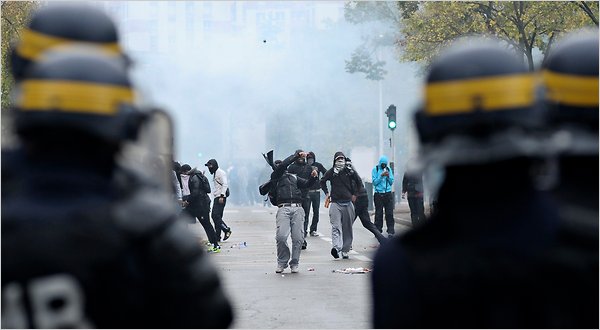 Battle: The police officers clash with rioters in Nanterre, north-west of Paris. They fired rubber bullets and tear gas at youths protesting outside their secondary schools